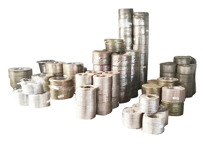 纏繞墊片是指用金屬帶(一般是v型鋼帶)與非金屬帶纏繞成環(huán)形的墊片,金屬帶與非金屬帶交替纏繞,由于其具有較好的彈性,廣泛用于石化、化工、電力等行業(yè)的法蘭密封結(jié)構(gòu)中,根據(jù)具體部位,可在墊片的內(nèi)層或外層加上鋼環(huán)來定位或加強(qiáng)。